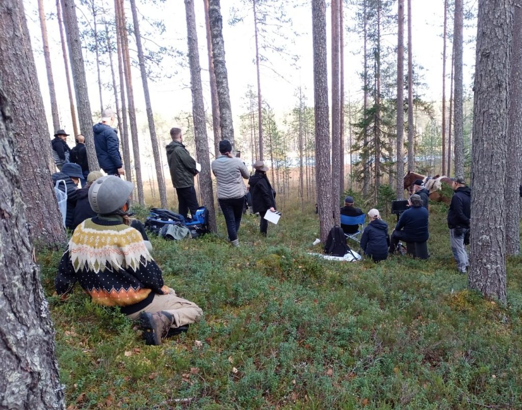 Jännitettiin vähän millaisessa paikassa Hiidenportilla kuvattaisiin. Olin käynyt siellä aiemmin tutustumassa paikkoihin ja todennut että maasto on todella haastavaa: pitkospuita, suota, jyrkkiä rinteitä ja kivikkoa. Onneksi hyvä kuvauspaikka oli löytynyt läheltä parkkipaikkaa, ja siinä pohja oli sammaleista mustikkakangasta mäntyineen. Vieressä oli suolampi. Kelikin oli aurinkoisempi ja sitä kautta hiukan lämpimämpi mitä kuvauksessa Bomballa.