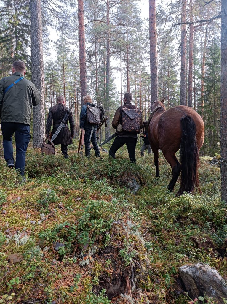 Kolmas kuvauspäivä oli meille siitä mukava, että se oli päätetty kuvata Kivikkolassa niin sanotulla Mini Unitilla, eli paikalle tuli pienoiskuvausryhmä ja kuvattavien kohtauksien näyttelijät. Ensin kuvattiin Usvan ja Sampon kanssa vielä vähän lisää talutusta metsässä liittyen ensimmäiseen päivään Bomballa. Sitten olikin Hertsin vuoro toimia Untamon ratsuna kohtauksessa missä Untamo laukkaa Kalervolaa kohti selässään jousipyssy. Näyttelijät olivat elokuvaan liittyen harjoitelleet ratsastusta jo aiemmin Etelä-Suomessa, eli ensimmäistä kertaa ei Eero Aho ollut hevosen selässä. Mutta onhan tuo melkoisen jännittävä ja vauhdikas hetki laukata maastossa kaikenlaiset muinaiset vermeet päällä. Hertsi varustettin kohtaukseen karvasatulalla, johon laitettiin ”Tohlopin varastolta” löytyneet vanhat jalustimet.