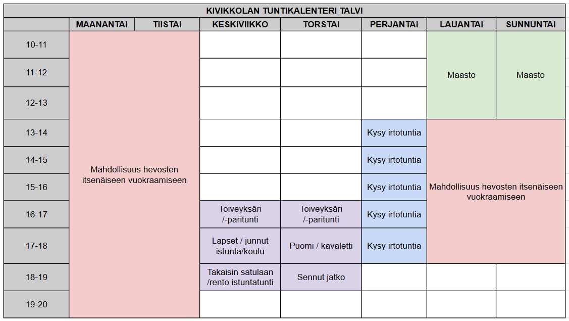Ratsun vuokran (tarkista onko hinta 10€/15€/20€/25€ ) voit tuoda käteisellä tallille tai suorittaa Kivikkolan maatilan tilille IBAN: FI12 8755 0710 0156 78 Saaja: Samuli Hakala. Viesti: Vuokraamasi ratsun nimi ja pvämäärä.